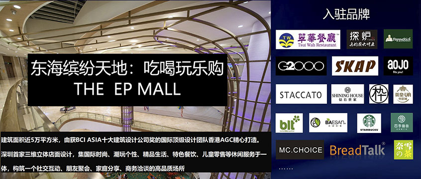 東海繽紛天地:吃喝玩樂(lè)購(gòu)、THE、EP MALL、建筑面積近5萬(wàn)平方米,由獲BCI ASIA十大建筑設(shè)計(jì)公司獎(jiǎng)的國(guó)際頂級(jí)設(shè)計(jì)團(tuán)隊(duì)香港AGC精心打造