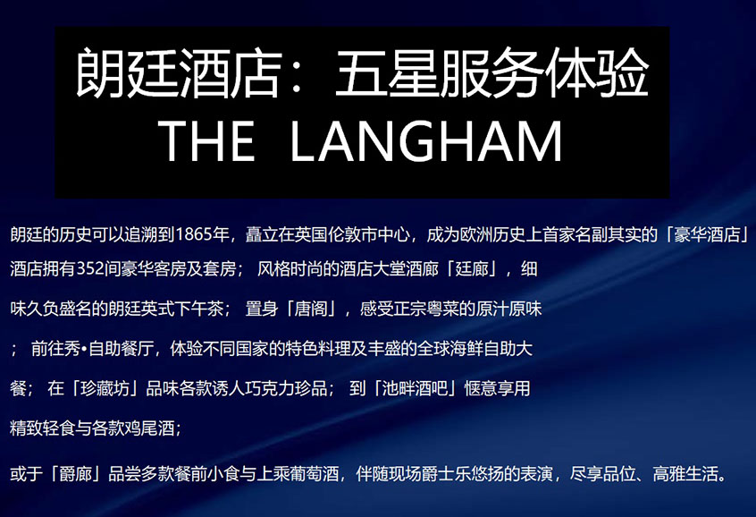 朗廷的歷史可以識(shí)溯到1865年,矗立在英國(guó)倫敦市中心。成為歐洲歷史上首家名副其實(shí)的(豪華酒店)酒店擁有352間豪華客房及套房;風(fēng)格時(shí)尚的酒店大堂酒廊「廷廊」,細(xì)味久負(fù)盛名的朗廷英式下午茶: 置身【唐閣」,感受正宗粵菜的原汁原味、前往秀?自助餐廳,體驗(yàn)不同國(guó)家的特色料理及豐盛的全球海鮮自助大餐;在[珍藏坊」品味各款誘人巧克力珍品: 到【池畔酒吧」愜意享用精致輕食與各款雞尾酒:或于「爵廊】品嘗多款餐前小食與上乘葡萄酒,伴隨現(xiàn)場(chǎng)廚士樂(lè)悠揚(yáng)的表演,盡事品位、高雅生活