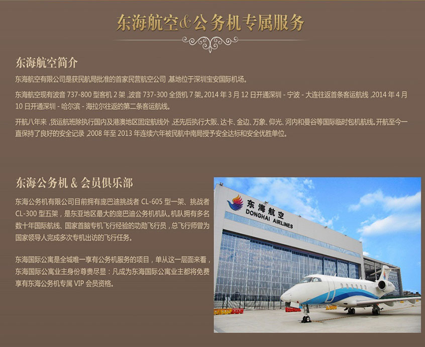 東海國(guó)際公寓是全城唯一享有公務(wù)機(jī)服務(wù)的項(xiàng)目,單從這一層面來(lái)看東海國(guó)際公寓業(yè)主身份尊貴盡顯:凡成為東海國(guó)際公寓業(yè)主都將免費(fèi)享有東海公務(wù)機(jī)專屬 VIP 會(huì)員資格