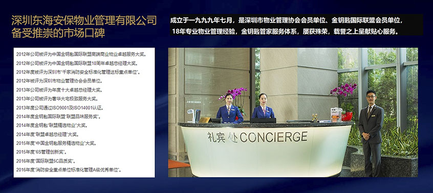 深圳東海安保物業(yè)管理有限公司、成立于一九九九年七月,是深圳市物業(yè)管理協(xié)會(huì)會(huì)員單位、金鑰匙國(guó)際聯(lián)盟會(huì)員單位,18年專業(yè)物業(yè)管理經(jīng)驗(yàn),金鑰匙管家服務(wù)體系,屢獲殊榮,載譽(yù)之上呈獻(xiàn)貼心服務(wù)