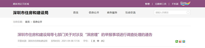 深圳市住房和建設(shè)局等七部門(mén)關(guān)于對(duì)涉及“深房理”的舉報(bào)事項(xiàng)進(jìn)行調(diào)查處理的通告