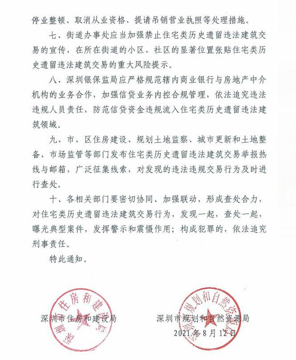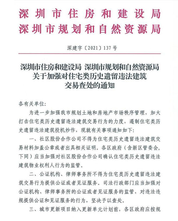 2021年08月19日、一則深圳《關(guān)于加強對住宅類歷史遺留違法建筑交易查處的通知》流出