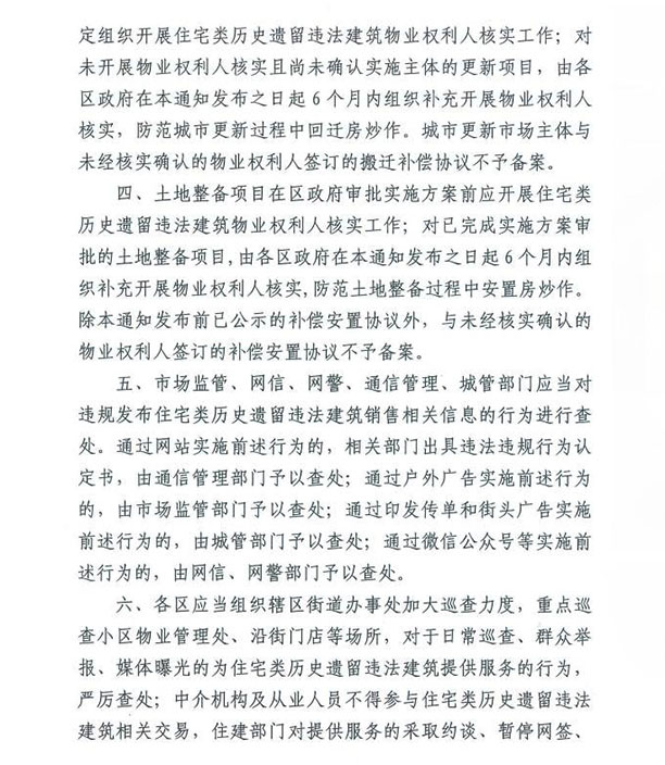 六、各區(qū)應(yīng)當組織轄區(qū)街道辦事處加大巡查力度,重點巡查小區(qū)物業(yè)管理處、沿街門店等場所,對于日常巡查、群眾舉報、媒體曝光的為住宅類歷史遺留違法建筑提供服務(wù)的行為,嚴厲查處;中介機構(gòu)及從業(yè)人員不得參與住宅類歷史遺留違法建筑相關(guān)交易,住建部門對提供服務(wù)的采取約談、暫停網(wǎng)簽、停業(yè)整頓、取消從業(yè)資格、提請吊銷營業(yè)執(zhí)照等處理措施