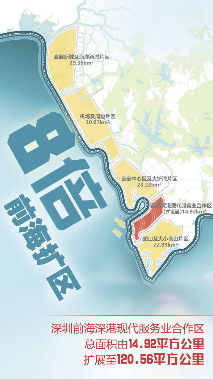 2021年09月06日,中共中央、國務(wù)院印發(fā)的《全面深化前海深港現(xiàn)代服務(wù)業(yè)合作區(qū)改革開放方案》發(fā)布,進(jìn)一步擴(kuò)展前海合作區(qū)發(fā)展空間。以現(xiàn)有前海合作區(qū)為基礎(chǔ),進(jìn)一步擴(kuò)展至以下區(qū)域:南側(cè)毗鄰的蛇口及大小南山片區(qū)〔東至后海大道、近海路、愛榕路、招商路、水灣路,南至深圳灣,西至月亮灣大道、珠江口,北至東濱路,包含中國(廣東)自由貿(mào)易試驗(yàn)區(qū)的蛇口區(qū)塊〕22.89平方公里;北側(cè)毗鄰的會展新城及海洋新城片區(qū)(東至松福大道,南至福永河,西至海岸線,北至東寶河、沙井北環(huán)路)29.36平方公里,機(jī)場及周邊片區(qū)(東至寶安大道,南至金灣大道、寶源路、碧灣路,西至海岸線,北至福永河、松福大道、福洲大道)30.07平方公里,寶安中心區(qū)及大鏟灣片區(qū)(東至寶安大道,南至雙界河,西至海岸線,北至金灣大道、寶源路、碧灣路,另包括大小鏟島、孖洲島)23.32平方公里。前海合作區(qū)總面積由14.92平方公里擴(kuò)展至120.56平方公里。