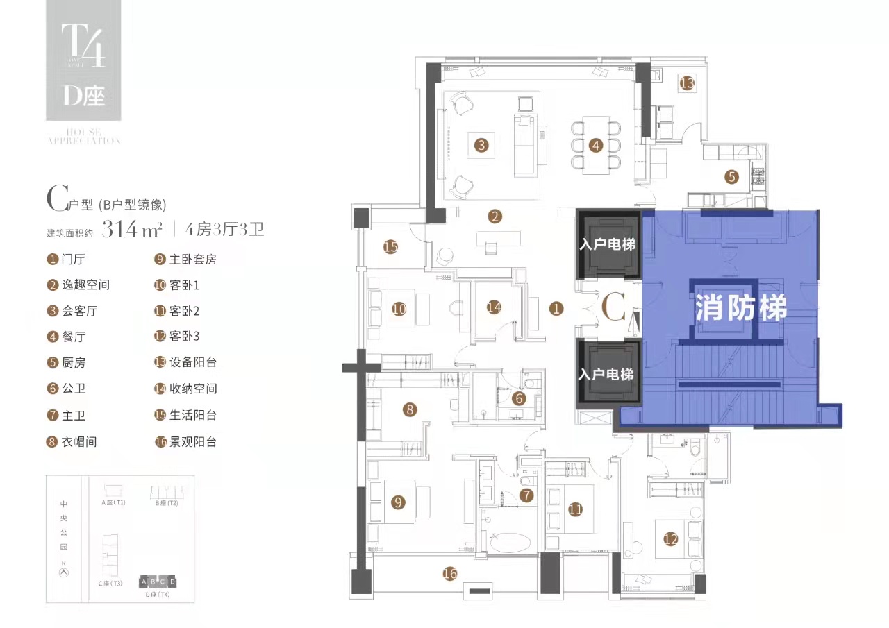 深圳中心天元 T4棟 D座 C戶型(B戶型鏡像)建筑面積約:314平米 4房3廳3衛(wèi) 戶型圖片