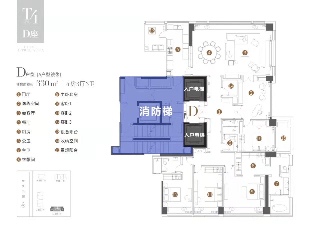 深圳中心天元 T4棟 D座 D戶型(A戶型鏡像)建筑面積約:330平米 4房3廳3衛(wèi) 戶型圖片