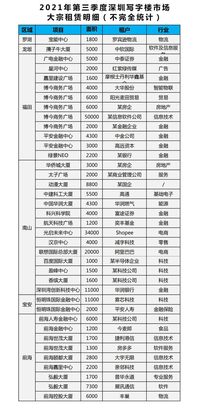 深圳的城市產(chǎn)業(yè)結(jié)構(gòu)已經(jīng)向中高端邁進,營商環(huán)境中的顯性成本,如租金等不會再具有明顯的優(yōu)勢。但是,深圳的隱性成本,比如更簡化的辦事程序、更優(yōu)質(zhì)的政務(wù)服務(wù)、更高的法治水平與市場環(huán)境,成功對沖了顯性成本的增長,最終做到了綜合成本最佳,從而吸引了這些企業(yè)的遷入深圳活躍的企業(yè),誕生超旺盛的辦公需求寫字樓,作為一個城市經(jīng)濟和企業(yè)活力的重要指標,更是將深圳經(jīng)濟的穩(wěn)健增長與十足的企業(yè)活力體現(xiàn)得淋漓盡致。得益于企業(yè)的數(shù)量增長及外地企業(yè)的進駐,第三季度,深圳甲級寫字樓吸納量達30.7萬㎡,創(chuàng)近年來單季度吸納量新高;甲級寫字樓平均租金也一改以往下降的趨勢,上升至207元/㎡?月,空置更是下降至22.3%,觸及近三年來低位水平。目前深圳辦公室租賃市場非?;钴S,特別是大宗租賃深圳大宗租賃占全部租賃面積的6成,頭部企業(yè)非常看好深圳,布局落點深圳現(xiàn)象非常明顯深圳租賃大客戶增多,成交面積達24萬㎡