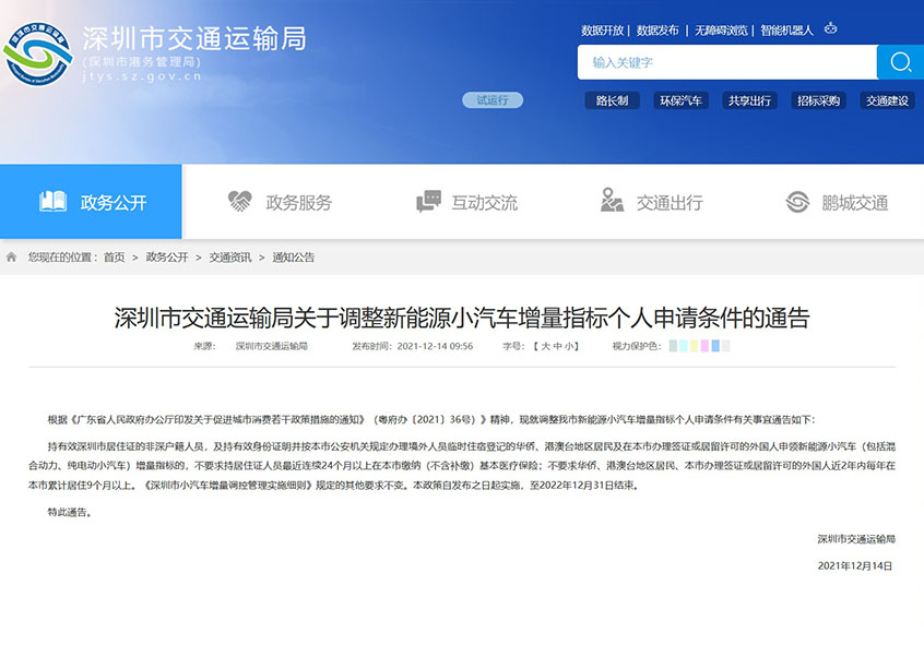 深圳市交通運(yùn)輸局關(guān)于調(diào)整新能源小汽車增量指標(biāo)個人申請條件的通告