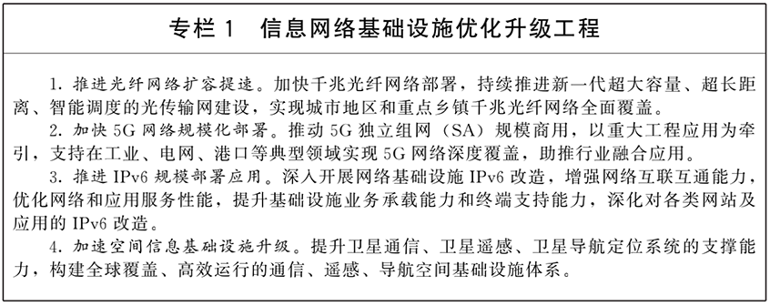 (一)加快建設(shè)信息網(wǎng)絡(luò)基礎(chǔ)設(shè)施。建設(shè)高速泛在、天地一體、云網(wǎng)融合、智能敏捷、綠色低碳、安全可控的智能化綜合性數(shù)字信息基礎(chǔ)設(shè)施。有序推進(jìn)骨干網(wǎng)擴(kuò)容,協(xié)同推進(jìn)千兆光纖網(wǎng)絡(luò)和5G網(wǎng)絡(luò)基礎(chǔ)設(shè)施建設(shè),推動(dòng)5G商用部署和規(guī)模應(yīng)用,前瞻布局第六代移動(dòng)通信(6G)網(wǎng)絡(luò)技術(shù)儲(chǔ)備,加大6G技術(shù)研發(fā)支持力度,積極參與推動(dòng)6G國(guó)際標(biāo)準(zhǔn)化工作。積極穩(wěn)妥推進(jìn)空間信息基礎(chǔ)設(shè)施演進(jìn)升級(jí),加快布局衛(wèi)星通信網(wǎng)絡(luò)等,推動(dòng)衛(wèi)星互聯(lián)網(wǎng)建設(shè)。提高物聯(lián)網(wǎng)在工業(yè)制造、農(nóng)業(yè)生產(chǎn)、公共服務(wù)、應(yīng)急管理等領(lǐng)域的覆蓋水平,增強(qiáng)固移融合、寬窄結(jié)合的物聯(lián)接入能力。