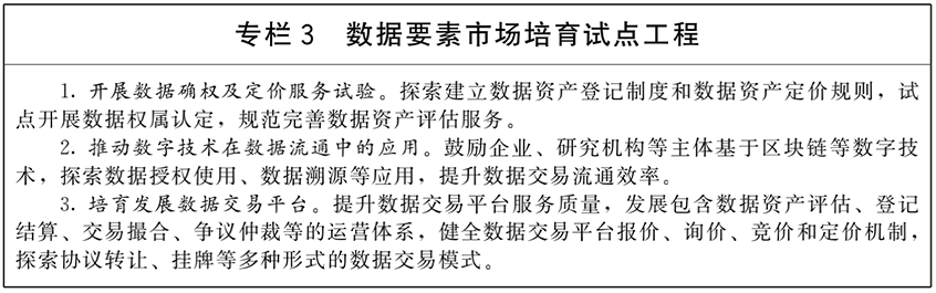(二)加快數(shù)據(jù)要素市場(chǎng)化流通。加快構(gòu)建數(shù)據(jù)要素市場(chǎng)規(guī)則,培育市場(chǎng)主體、完善治理體系,促進(jìn)數(shù)據(jù)要素市場(chǎng)流通。鼓勵(lì)市場(chǎng)主體探索數(shù)據(jù)資產(chǎn)定價(jià)機(jī)制,推動(dòng)形成數(shù)據(jù)資產(chǎn)目錄,逐步完善數(shù)據(jù)定價(jià)體系。規(guī)范數(shù)據(jù)交易管理,培育規(guī)范的數(shù)據(jù)交易平臺(tái)和市場(chǎng)主體,建立健全數(shù)據(jù)資產(chǎn)評(píng)估、登記結(jié)算、交易撮合、爭(zhēng)議仲裁等市場(chǎng)運(yùn)營(yíng)體系,提升數(shù)據(jù)交易效率。嚴(yán)厲打擊數(shù)據(jù)黑市交易,營(yíng)造安全有序的市場(chǎng)環(huán)境。