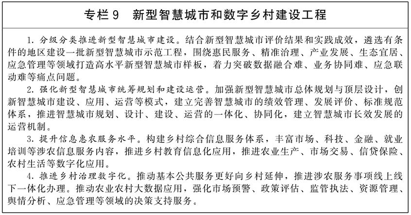 (三)推動(dòng)數(shù)字城鄉(xiāng)融合發(fā)展。統(tǒng)籌推動(dòng)新型智慧城市和數(shù)字鄉(xiāng)村建設(shè),協(xié)同優(yōu)化城鄉(xiāng)公共服務(wù)。深化新型智慧城市建設(shè),推動(dòng)城市數(shù)據(jù)整合共享和業(yè)務(wù)協(xié)同,提升城市綜合管理服務(wù)能力,完善城市信息模型平臺(tái)和運(yùn)行管理服務(wù)平臺(tái),因地制宜構(gòu)建數(shù)字孿生城市。加快城市智能設(shè)施向鄉(xiāng)村延伸覆蓋,完善農(nóng)村地區(qū)信息化服務(wù)供給,推進(jìn)城鄉(xiāng)要素雙向自由流動(dòng),合理配置公共資源,形成以城帶鄉(xiāng)、共建共享的數(shù)字城鄉(xiāng)融合發(fā)展格局。構(gòu)建城鄉(xiāng)常住人口動(dòng)態(tài)統(tǒng)計(jì)發(fā)布機(jī)制,利用數(shù)字化手段助力提升城鄉(xiāng)基本公共服務(wù)水平。