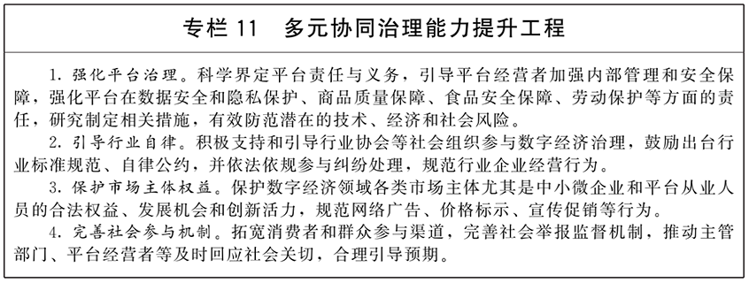 (三)完善多元共治新格局。建立完善政府、平臺(tái)、企業(yè)、行業(yè)組織和社會(huì)公眾多元參與、有效協(xié)同的數(shù)字經(jīng)濟(jì)治理新格局,形成治理合力,鼓勵(lì)良性競(jìng)爭(zhēng),維護(hù)公平有效市場(chǎng)。加快健全市場(chǎng)準(zhǔn)入制度、公平競(jìng)爭(zhēng)審查機(jī)制,完善數(shù)字經(jīng)濟(jì)公平競(jìng)爭(zhēng)監(jiān)管制度,預(yù)防和制止濫用行政權(quán)力排除限制競(jìng)爭(zhēng)。進(jìn)一步明確平臺(tái)企業(yè)主體責(zé)任和義務(wù),推進(jìn)行業(yè)服務(wù)標(biāo)準(zhǔn)建設(shè)和行業(yè)自律,保護(hù)平臺(tái)從業(yè)人員和消費(fèi)者合法權(quán)益。開展社會(huì)監(jiān)督、媒體監(jiān)督、公眾監(jiān)督,培育多元治理、協(xié)調(diào)發(fā)展新生態(tài)。鼓勵(lì)建立爭(zhēng)議在線解決機(jī)制和渠道,制定并公示爭(zhēng)議解決規(guī)則。引導(dǎo)社會(huì)各界積極參與推動(dòng)數(shù)字經(jīng)濟(jì)治理,加強(qiáng)和改進(jìn)反壟斷執(zhí)法,暢通多元主體訴求表達(dá)、權(quán)益保障渠道,及時(shí)化解矛盾糾紛,維護(hù)公眾利益和社會(huì)穩(wěn)定。