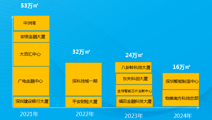 福田區(qū)未來2021年-2024年供應(yīng)約125萬㎡,項目分布較分散。未來福田區(qū)雖然面臨的寫字樓供應(yīng)項目不多,但由于單項目體量較大,總供應(yīng)量拉大