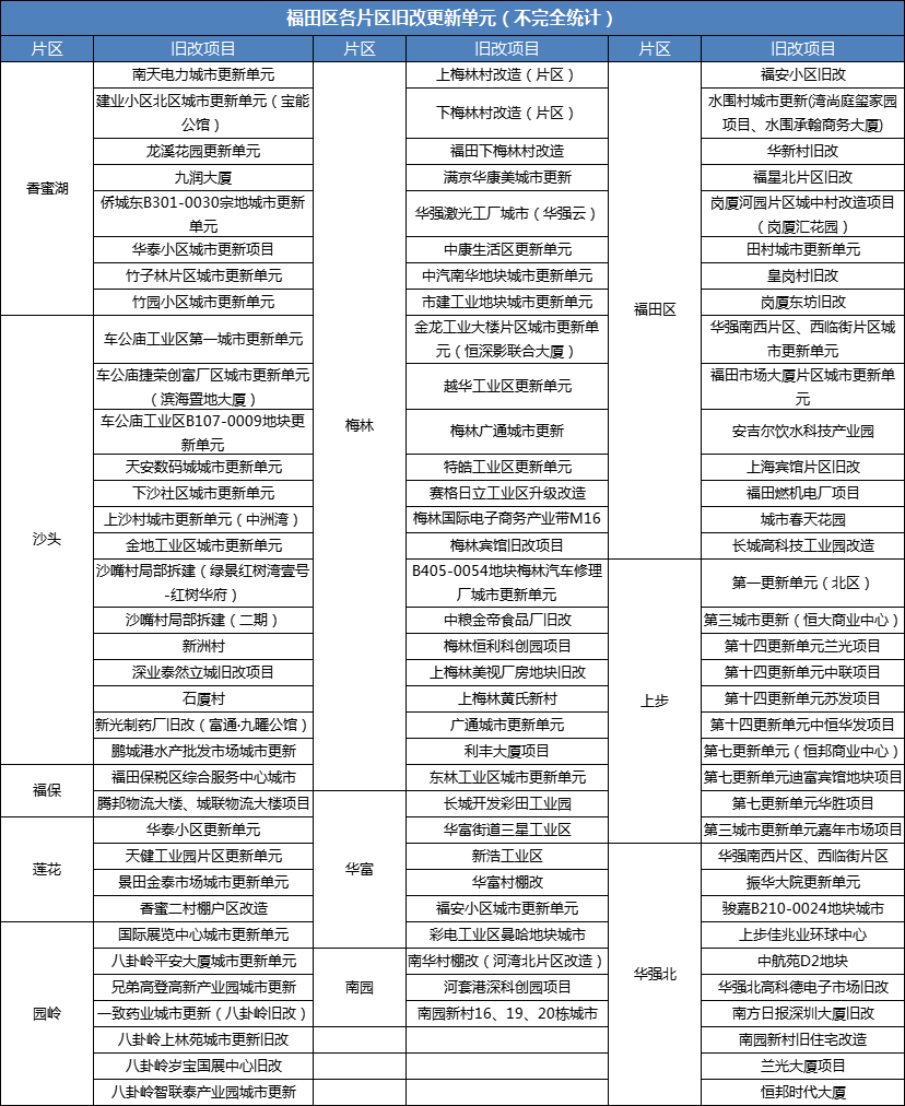 福田區(qū)計劃在列城市更新項目共計103個,2021年首批集中新開工項目共27個,總投資529億元,占全市20%,居各區(qū)之首。接下來,福田區(qū)還將進(jìn)一步發(fā)揮重大項目建設(shè)的牽引作用,穩(wěn)步推進(jìn)舊改更新