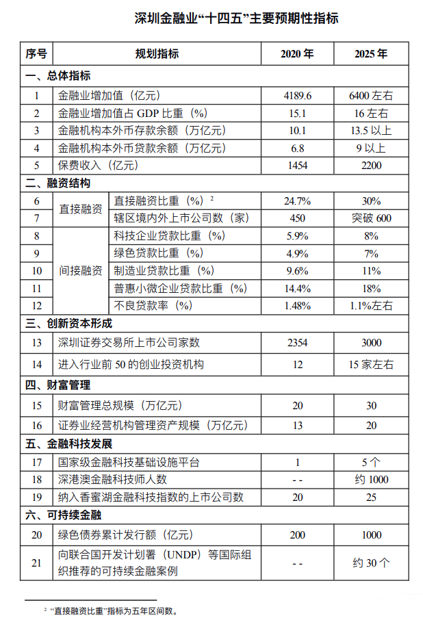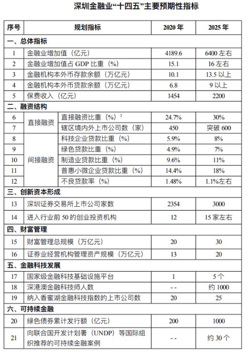 值得關(guān)注的是,“十四五”深圳金融業(yè)發(fā)展預(yù)期達(dá)到的系列指標(biāo)里,包括希望金融業(yè)增加值達(dá)到6400億元左右、占地方生產(chǎn)總值比重16%左右,支柱地位進(jìn)一步凸顯。