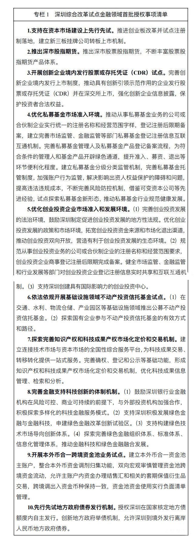 在未來(lái)5年重點(diǎn)任務(wù)中,規(guī)劃將“以國(guó)家戰(zhàn)略為牽引,推進(jìn)金融業(yè)全面深化改革擴(kuò)大開(kāi)放”擺在首位,圍繞綜合改革試點(diǎn)金融領(lǐng)域首批授權(quán)事項(xiàng)清單,提出擴(kuò)大高水平金融對(duì)外開(kāi)放,包括進(jìn)一步拓展跨境人民幣結(jié)算業(yè)務(wù);試點(diǎn)深化外匯管理改革;促進(jìn)與港澳金融市場(chǎng)互聯(lián)互通,優(yōu)化深港通機(jī)制,擴(kuò)大基金互認(rèn)、ETF(交易所交易基金)互聯(lián)互通范圍;推進(jìn)前海、河套等戰(zhàn)略平臺(tái)金融試驗(yàn)示范;探索創(chuàng)新跨境金融監(jiān)管;探索知識(shí)產(chǎn)權(quán)交易和知識(shí)產(chǎn)權(quán)證券化;推動(dòng)數(shù)字人民幣國(guó)際合作和跨境使用等等。