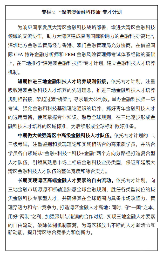 規(guī)劃提出,為響應(yīng)國(guó)家發(fā)展大灣區(qū)金融科技戰(zhàn)略部署,增進(jìn)大灣區(qū)金融科技領(lǐng)域的交流協(xié)作,助力大灣區(qū)建成具有國(guó)際影響力的金融科技“高地”,深圳地方金融監(jiān)管局經(jīng)與香港、澳門金融管理局充分協(xié)商,在借鑒國(guó)際CFA特許金融分析師和FRM金融風(fēng)險(xiǎn)管理師考試體系經(jīng)驗(yàn)的基礎(chǔ)上,在三地推行“深港澳金融科技師”專才計(jì)劃,建立金融科技人才培養(yǎng)機(jī)制。