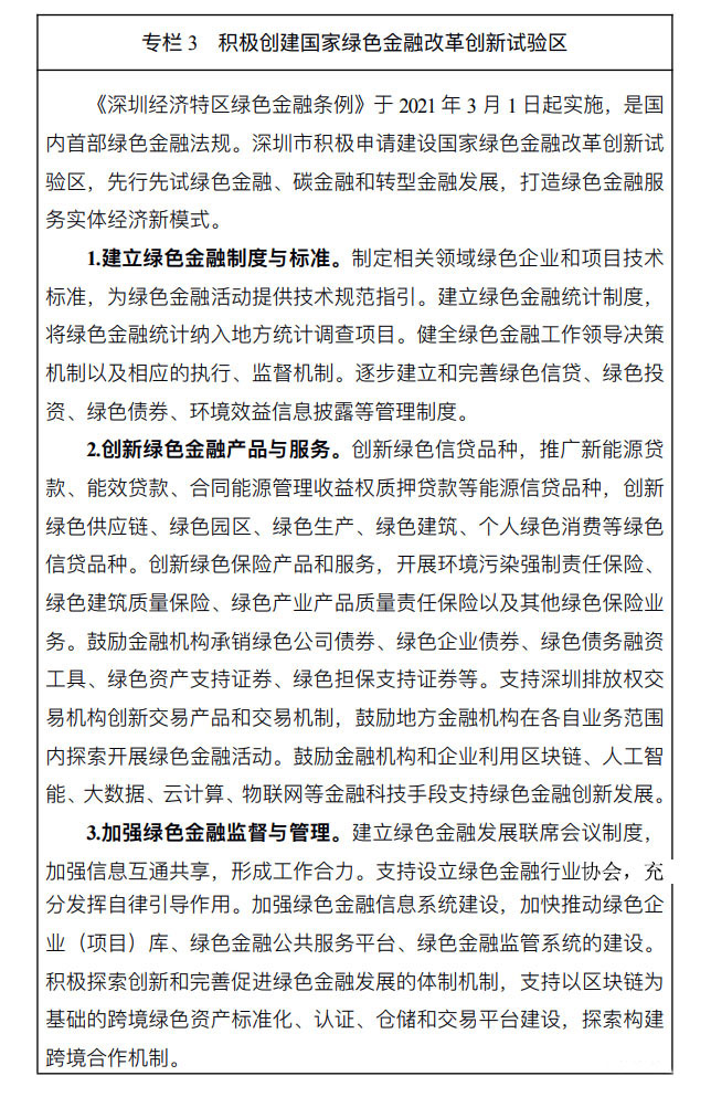 組織實(shí)施《深圳經(jīng)濟(jì)特區(qū)綠色金融條例》及配套制度,提升綠色金融服務(wù)實(shí)體經(jīng)濟(jì)能力,促進(jìn)綠色金融、碳金融、氣候投融資、轉(zhuǎn)型金融發(fā)展,助力碳達(dá)峰碳中和戰(zhàn)略實(shí)施。積極引導(dǎo)金融機(jī)構(gòu)率先實(shí)現(xiàn)自身碳中和。鼓勵(lì)金融機(jī)構(gòu)設(shè)立專營(yíng)綠色金融業(yè)務(wù)的分支機(jī)構(gòu)、營(yíng)業(yè)部、事業(yè)部等,支持國(guó)際知名綠色金融、可持續(xù)金融社會(huì)組織在深設(shè)立地區(qū)中心、分中心或分支機(jī)構(gòu)。推廣國(guó)家綠色金融標(biāo)準(zhǔn),組織制定配套制度或補(bǔ)充性地方標(biāo)準(zhǔn),推動(dòng)國(guó)內(nèi)和國(guó)際標(biāo)準(zhǔn)互認(rèn)。大力開(kāi)展綠色信貸、綠色債券、綠色基金、綠色咨詢與評(píng)級(jí)、環(huán)境權(quán)益抵質(zhì)押融資等業(yè)務(wù),優(yōu)先支持綠色企業(yè)上市融資;鼓勵(lì)利用區(qū)塊鏈、人工智能、大數(shù)據(jù)、云計(jì)算、物聯(lián)網(wǎng)等科技手段支持綠色金融創(chuàng)新發(fā)展,探索建立境外綠色市政債常態(tài)化發(fā)行機(jī)制。依托現(xiàn)有交易平臺(tái),建立健全服務(wù)企業(yè)清潔、低碳、綠色發(fā)展的環(huán)境權(quán)益交易市場(chǎng),積極培育高效便捷的排放權(quán)、排污權(quán)、節(jié)能量(用能權(quán))、水權(quán)交易市場(chǎng)。建立健全氣候投融資機(jī)制,研究支持碳達(dá)峰碳中和目標(biāo)愿景的綠色金融路線規(guī)劃。探索推動(dòng)金融資源向生物多樣性保護(hù)領(lǐng)域和基于自然的解決方案傾斜,引導(dǎo)資金流向生態(tài)友好型項(xiàng)目。爭(zhēng)創(chuàng)國(guó)家綠色金融改革創(chuàng)新試驗(yàn)區(qū)。