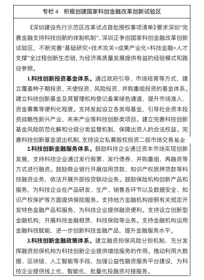 在創(chuàng)建國(guó)家科創(chuàng)金融改革創(chuàng)新試驗(yàn)區(qū)上,深圳將不斷完善“基礎(chǔ)研究+技術(shù)攻關(guān)+成果產(chǎn)業(yè)化+科技金融+人才支撐”全過(guò)程創(chuàng)新生態(tài)鏈,為經(jīng)濟(jì)高質(zhì)量發(fā)展提供有益的經(jīng)驗(yàn)?zāi)J胶吐窂絽⒄眨ń⒖萍紕?chuàng)新投資基金體系、科技創(chuàng)新金融服務(wù)體系、科技創(chuàng)新金融政策體系。