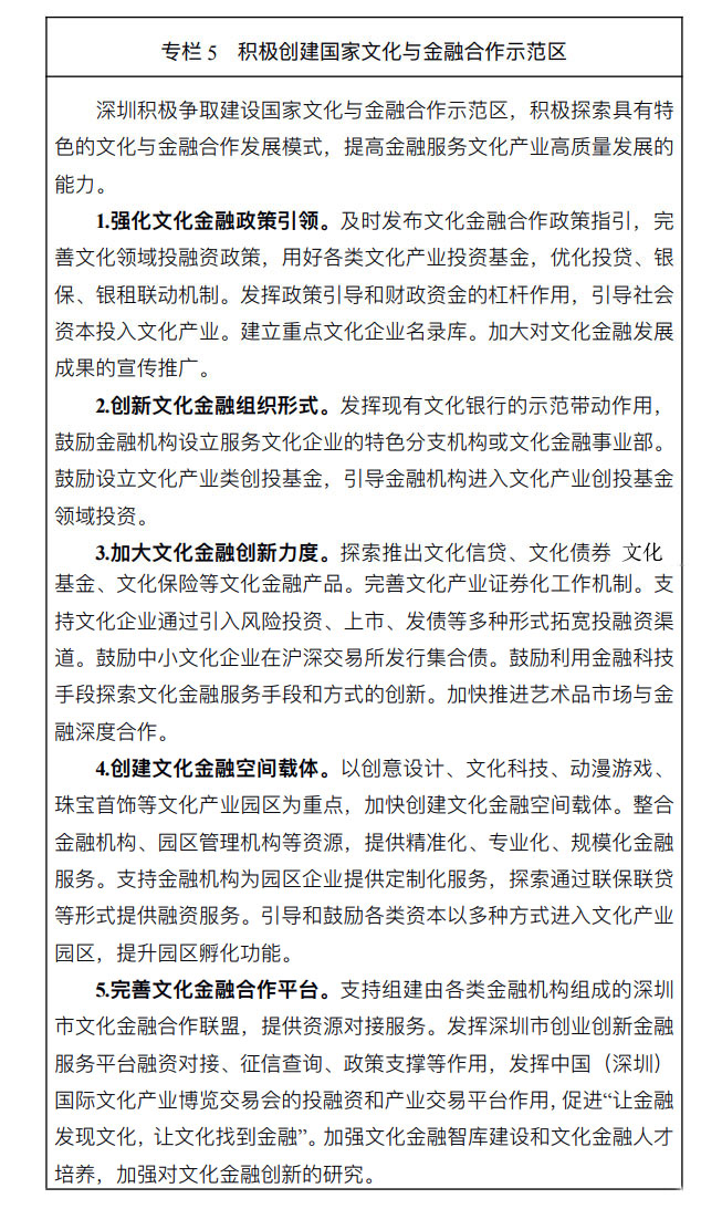推動(dòng)金融機(jī)構(gòu)結(jié)合深圳文創(chuàng)市場(chǎng)的實(shí)際需求,探索文化信貸、文化債券、文化基金、文化保險(xiǎn)等文化金融產(chǎn)品。爭(zhēng)取國(guó)家支持深圳建設(shè)文化與金融合作示范區(qū)。