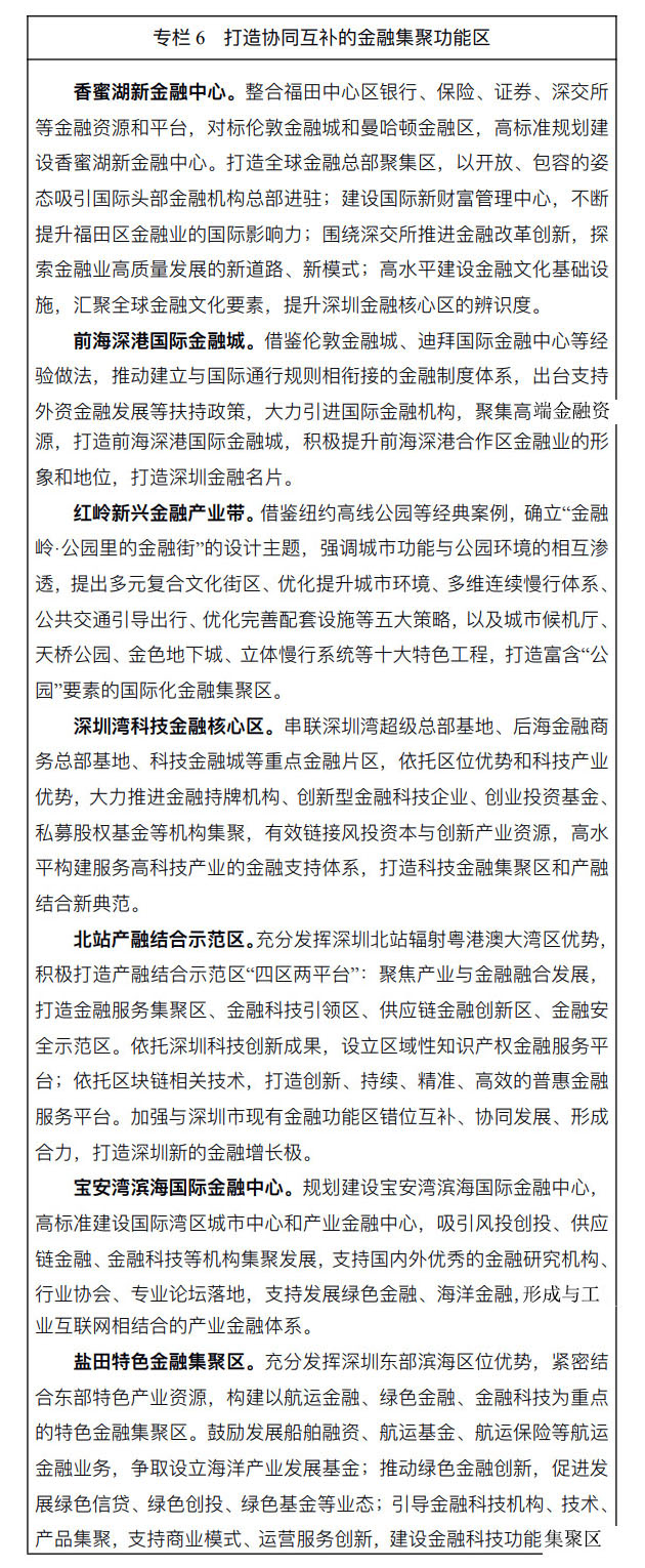 優(yōu)化金融集聚區(qū)功能布局,創(chuàng)新管理體制機(jī)制,建設(shè)一流現(xiàn)代金融服務(wù)區(qū)。加快推進(jìn)香蜜湖新金融中心建設(shè),充分發(fā)揮集聚效應(yīng),構(gòu)建業(yè)態(tài)豐富、創(chuàng)新活躍、空間集聚、功能完善的現(xiàn)代金融產(chǎn)業(yè)體系,打造國(guó)際一流金融商務(wù)街區(qū)。聯(lián)動(dòng)香港推進(jìn)前海深港國(guó)際金融城建設(shè),建立健全對(duì)接港澳的開(kāi)放型新體制和跨境合作制度體系,逐步形成多層次、多功能的金融市場(chǎng)和完備的金融服務(wù)產(chǎn)業(yè)鏈條。高水平規(guī)劃建設(shè)紅嶺新興金融產(chǎn)業(yè)帶,固化傳統(tǒng)金融資源,吸引資產(chǎn)管理、商貿(mào)物流金融、金融科技等創(chuàng)新機(jī)構(gòu)集聚發(fā)展,形成傳統(tǒng)金融和創(chuàng)新金融優(yōu)勢(shì)互補(bǔ)格局。高水平規(guī)劃建設(shè)紅嶺新興金融產(chǎn)業(yè)帶,重點(diǎn)布局金融總部、財(cái)富管理、綠色金融、消費(fèi)金融、黃金金融、金融科技等業(yè)態(tài),打造傳統(tǒng)金融穩(wěn)健發(fā)展、新興金融蓬勃發(fā)展、特色金融創(chuàng)新發(fā)展的格局。全力打造深圳灣科技金融核心區(qū),持續(xù)引進(jìn)金融持牌機(jī)構(gòu),培育發(fā)展創(chuàng)新型金融科技企業(yè),推動(dòng)以創(chuàng)業(yè)投資為主的各類私募基金集聚,構(gòu)建國(guó)際一流的科技金融集聚區(qū)。依托深港口岸經(jīng)濟(jì)帶羅湖先行區(qū)高水平規(guī)劃建設(shè)黃金金融功能區(qū),支持金融機(jī)構(gòu)創(chuàng)新發(fā)展黃金金融產(chǎn)品與服務(wù),積極探索黃金資產(chǎn)證券化,打造深圳黃金回購(gòu)區(qū)域品牌。加快規(guī)劃建設(shè)北站產(chǎn)融結(jié)合示范區(qū)、寶安灣濱海國(guó)際金融中心,大力探索集聚金融資源與服務(wù)實(shí)體經(jīng)濟(jì)協(xié)同路徑,打造深圳新的金融增長(zhǎng)極。在鹽田、龍崗、坪山、光明、大鵬等區(qū)域規(guī)劃建設(shè)若干特色金融功能區(qū),圍繞重點(diǎn)產(chǎn)業(yè)、重點(diǎn)領(lǐng)域的金融需求,發(fā)展消費(fèi)金融、科技金融、海洋金融、產(chǎn)業(yè)金融、文化金融等業(yè)態(tài),形成各有側(cè)重、互補(bǔ)發(fā)展格局。