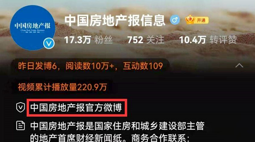 這篇文章的微博的作者“中國房地產(chǎn)報(bào)信息”,官方認(rèn)證為“中國房地產(chǎn)報(bào)”