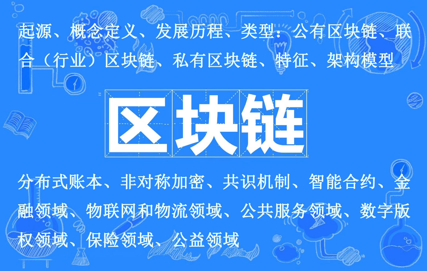 區(qū)塊鏈、起源、概念定義、發(fā)展歷程、公有區(qū)塊鏈、聯(lián)合(行業(yè))區(qū)塊鏈、私有區(qū)塊鏈、特征、架構(gòu)模型、分布式賬本、非對(duì)稱加密、共識(shí)機(jī)制、智能合約、金融領(lǐng)域、物聯(lián)網(wǎng)和物流領(lǐng)域、公共服務(wù)領(lǐng)域、數(shù)字版權(quán)領(lǐng)域、保險(xiǎn)領(lǐng)域、公益領(lǐng)域