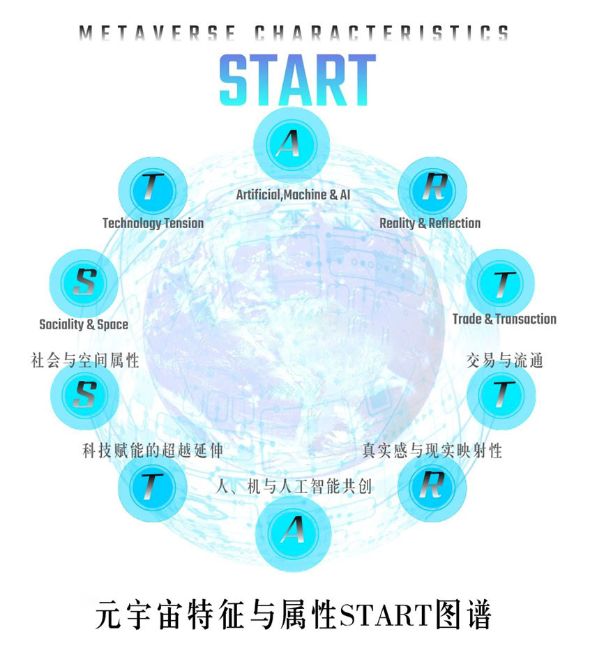 在元宇宙特征與屬性的START圖譜中,北京大學(xué)陳剛教授與董浩宇博士梳理并系統(tǒng)界定了元宇宙的五大特征與屬性,即:社會與空間屬性(Social & Space)、科技賦能的超越延伸(Technology Tension)、人、機(jī)與人工智能共創(chuàng)(ArtifIcal, Machine & AI)、真實感與現(xiàn)實映射性(Reality & Reflection)、交易與流通(Trade & Transaction)。