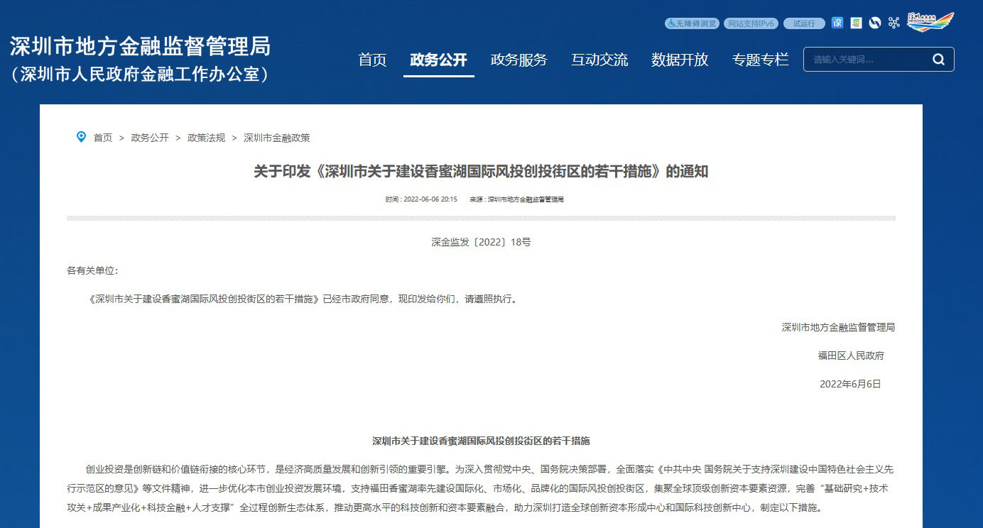2022年6月6日晚,深圳市地方金融監(jiān)督管理局發(fā)布了《深圳市關(guān)于建設(shè)香蜜湖國(guó)際風(fēng)投創(chuàng)投街區(qū)的若干措施》的通知(以下簡(jiǎn)稱《措施》)。