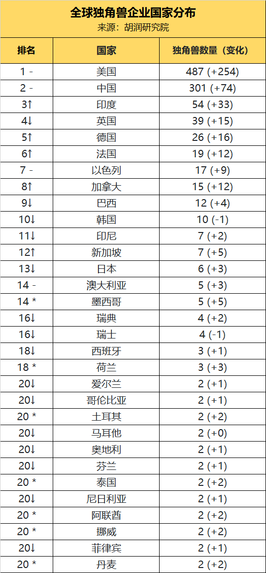 在全球獨(dú)角獸榜單中,美國以487家排名第一,比去年增加254家;中國以301家排名第二,比去年增加74家。中美兩國占全球獨(dú)角獸總數(shù)的74%,此外,印度獨(dú)角獸企業(yè)數(shù)量排名全球第3、英國第4、德國第5