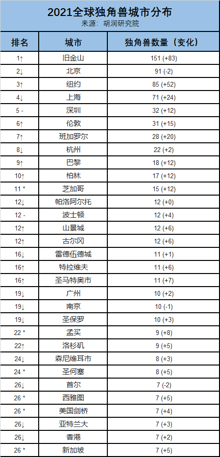 全球獨(dú)角獸最多的十大城市依次為