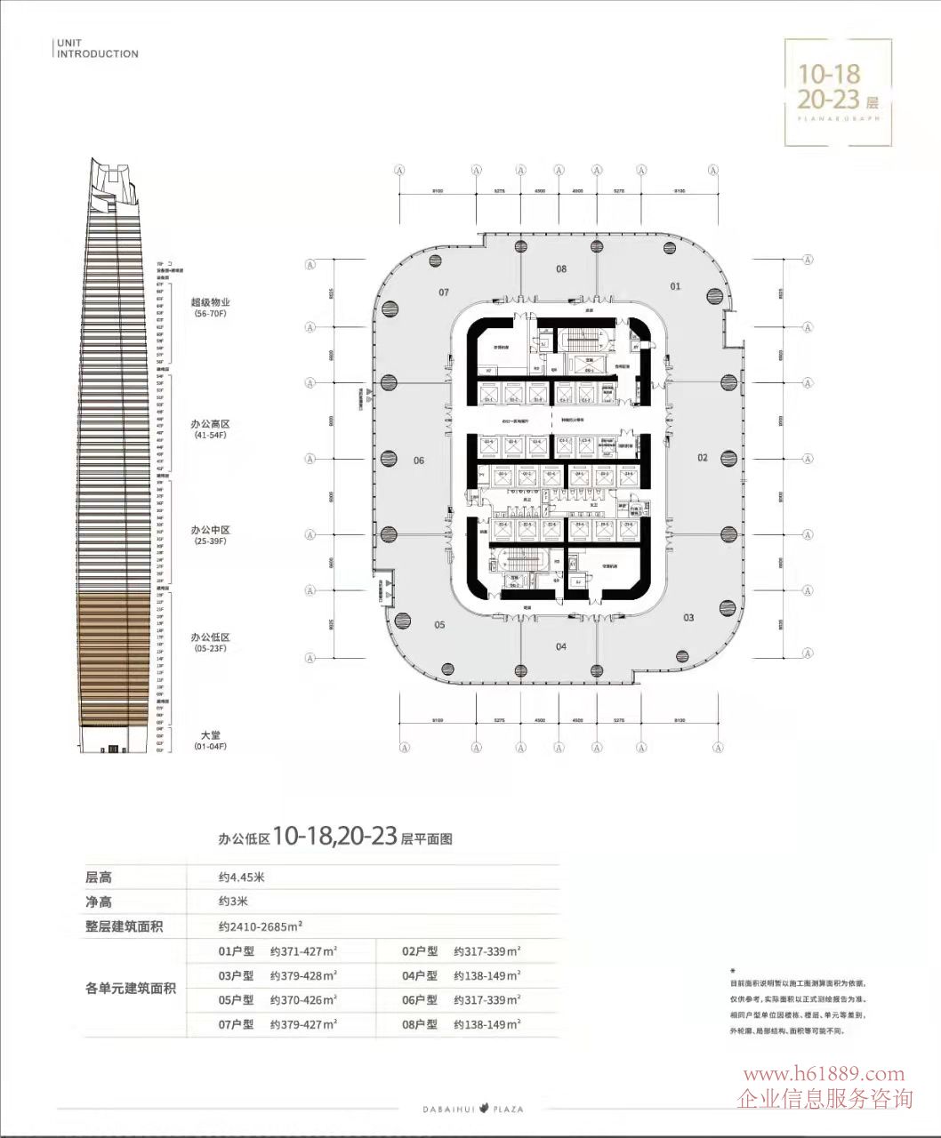 私募證券大廈【原大百匯廣場(chǎng)】:辦公低區(qū) 10到18層、20到23層平面圖、層高約:4.45米、凈高約3米、整層建筑面積約:2410平米到2685平米、各單元建筑面積: