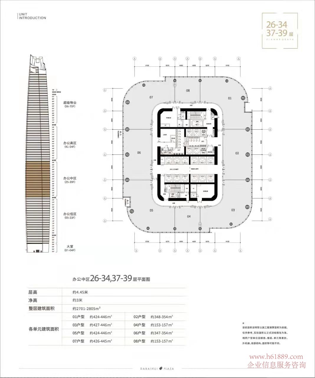 私募證券大廈【原大百匯廣場(chǎng)】:辦公中區(qū) 26到34層、37到39層平面圖、層高約:4.45米、凈高約3米、整層建筑面積約:2701平米到2805平米、各單元建筑面積: