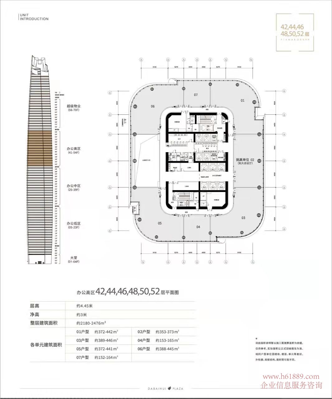 私募證券大廈【原大百匯廣場(chǎng)】:辦公高區(qū) 42層、44層、46層、48層、50層、52層平面圖、層高約:4.45米、凈高約3米、整層建筑面積約:2180平米到2476平米、各單元建筑面積: