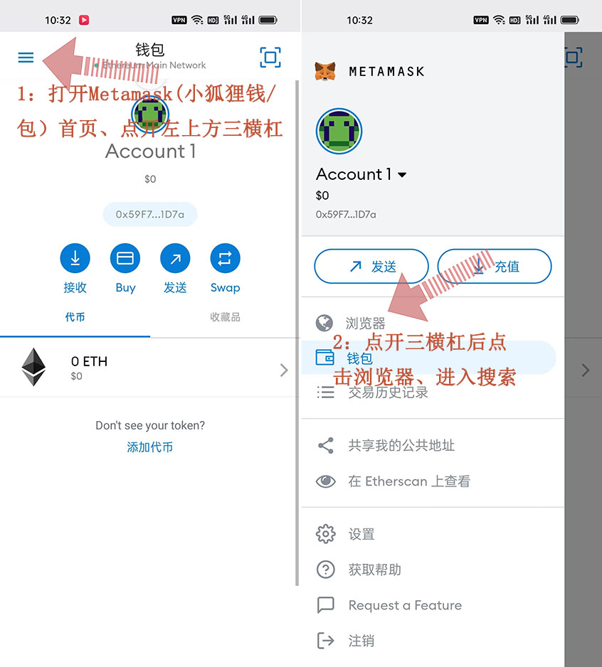 1:打開(kāi) Metamask(小狐貍錢/包)首頁(yè)、點(diǎn)開(kāi)左上方三橫杠