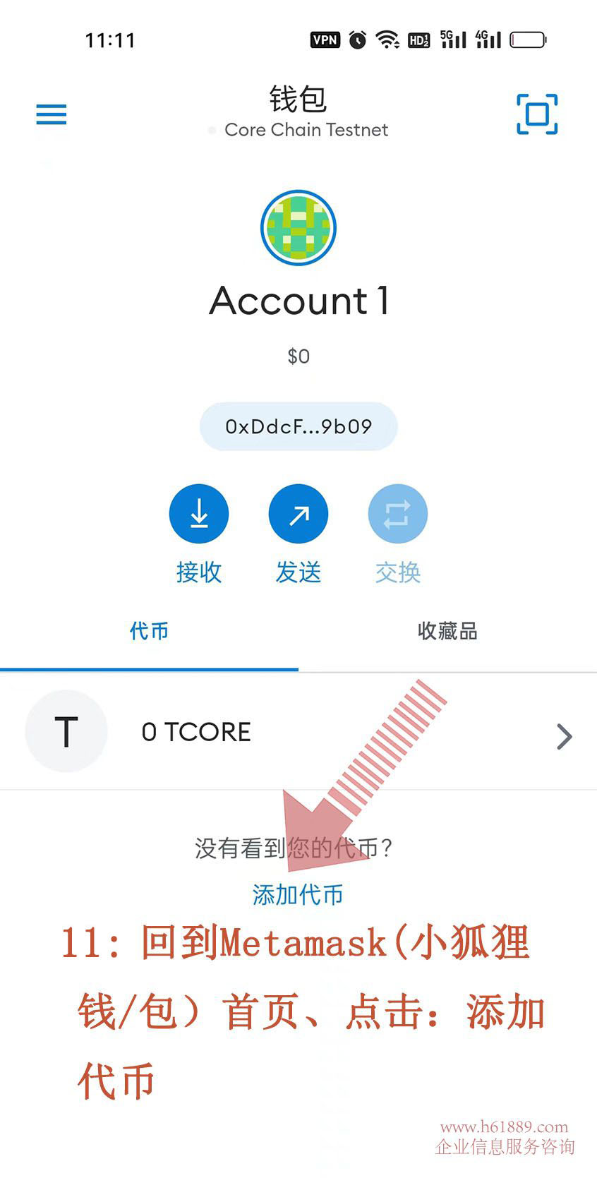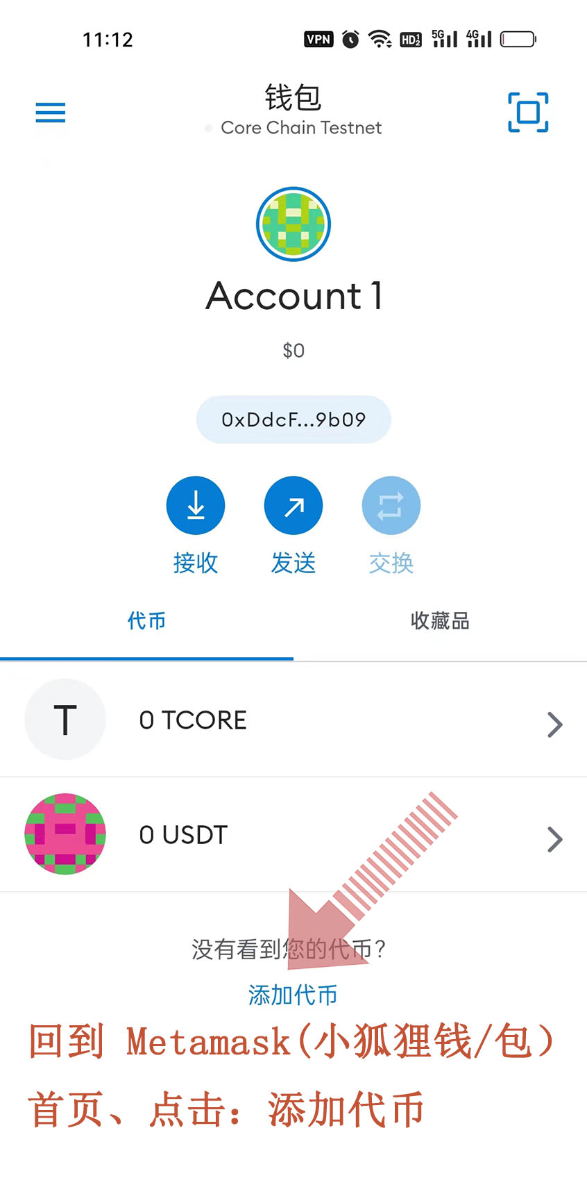 11:回到 Metamask(小狐貍錢/包)首頁(yè)、點(diǎn)擊:添加代幣