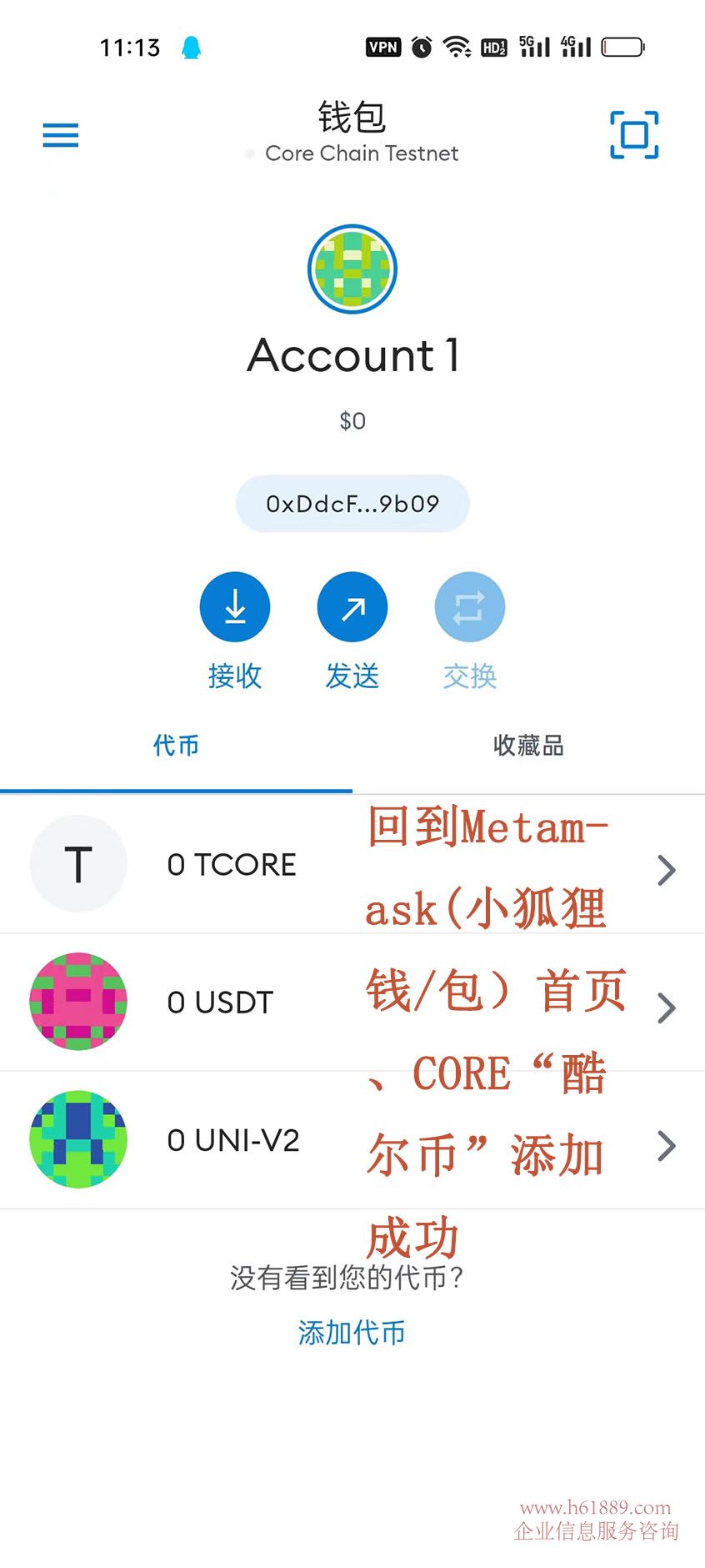 回到 Metamask(小狐貍錢/包)首頁(yè)、CORE“酷爾幣”添加成功