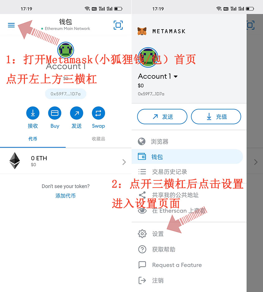1:打開(kāi)Metamask(小狐貍錢/包)首頁(yè)、點(diǎn)開(kāi)左上方三橫杠、2:點(diǎn)開(kāi)三橫杠后點(diǎn)擊設(shè)置、進(jìn)入設(shè)置頁(yè)面