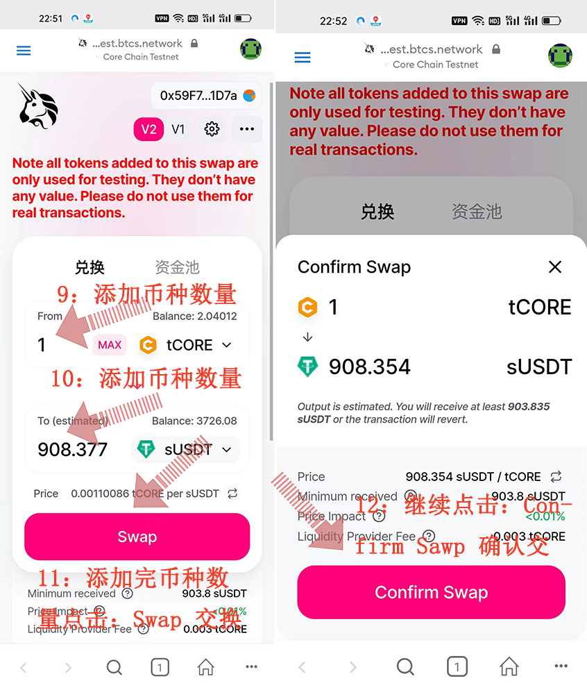 11:添加完幣種數(shù)量點(diǎn)擊:Swap 交換、12:繼續(xù)點(diǎn)擊:Confirm Sawp 確認(rèn)交換