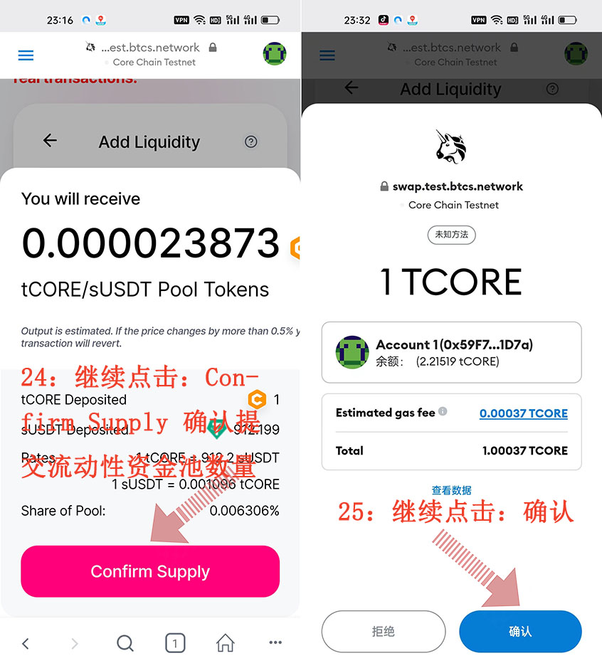 24:繼續(xù)點(diǎn)擊:Confirm Supply 確認(rèn)提交流動性資金池數(shù)量、25:繼續(xù)點(diǎn)擊:確認(rèn)