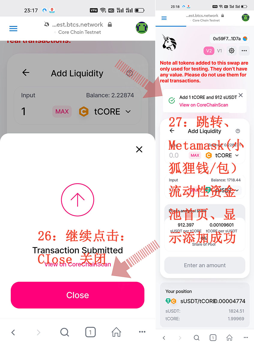 26:繼續(xù)點(diǎn)擊:CIose 關(guān)閉、27:跳轉(zhuǎn)、Metamask(小狐貍錢/包)流動性資金池首頁、顯示添加成功