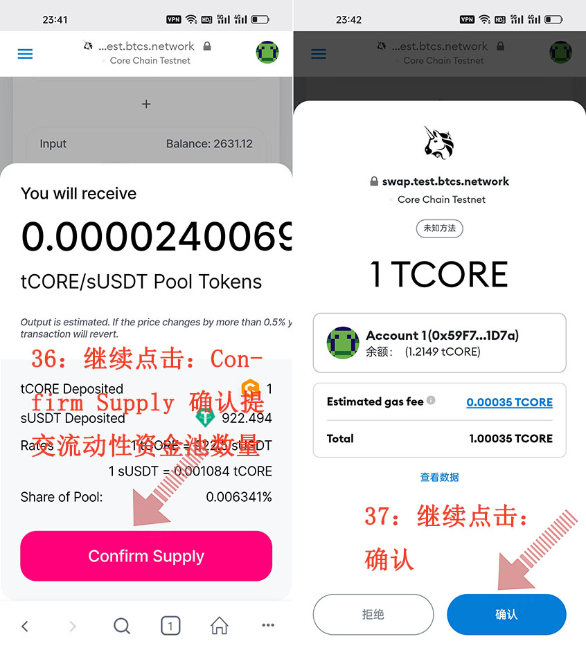 36:繼續(xù)點(diǎn)擊:Confirm Supply 確認(rèn)提交流動性資金池數(shù)量、37:繼續(xù)點(diǎn)擊:確認(rèn)