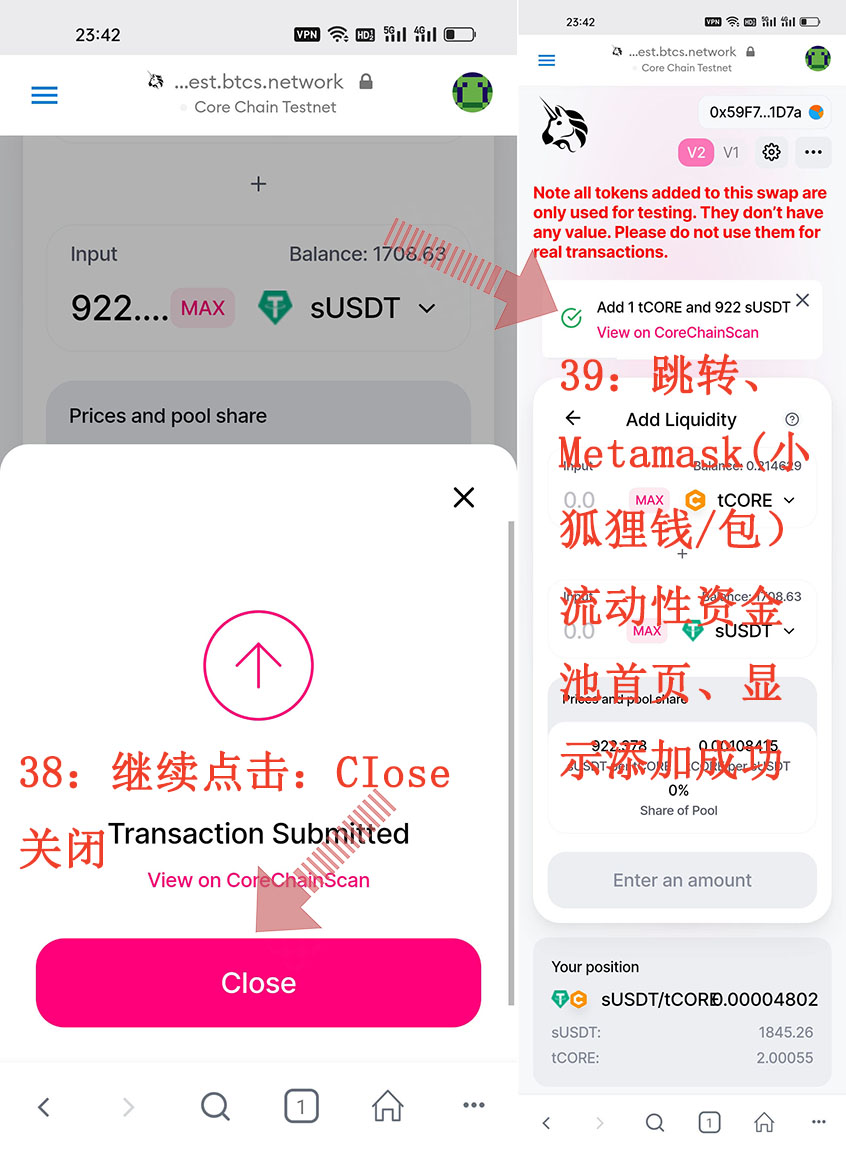 38:繼續(xù)點(diǎn)擊:CIose 關(guān)閉、39:跳轉(zhuǎn)、Metamask(小狐貍錢/包)流動性資金池首頁、顯示添加成功