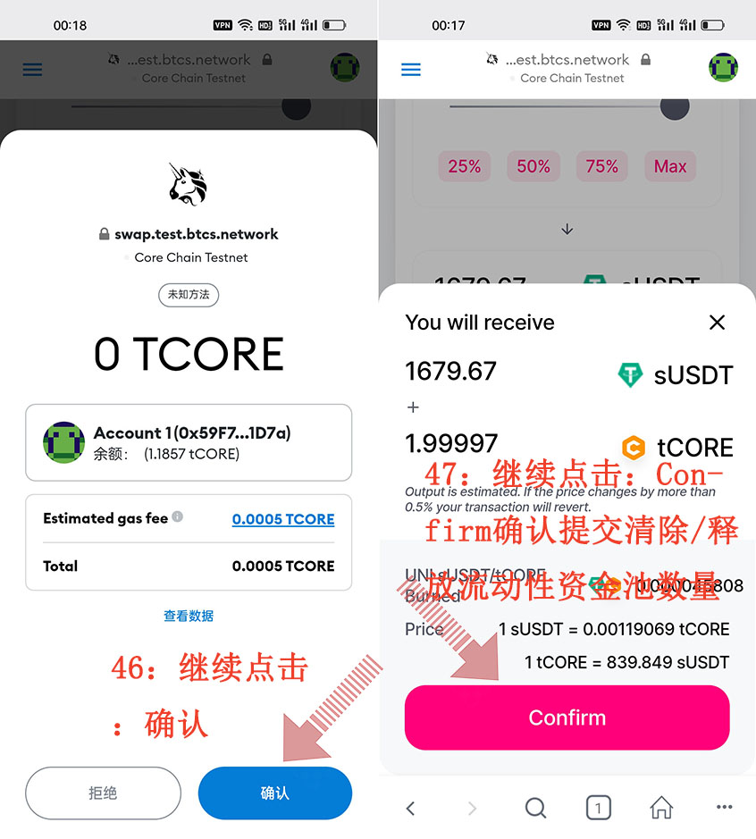 46:繼續(xù)點(diǎn)擊:確認(rèn)、47:繼續(xù)點(diǎn)擊:Confirm確認(rèn)提交清除/釋放流動性資金池數(shù)量