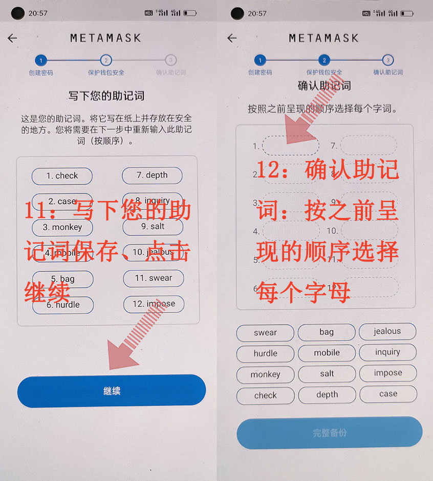 11:寫下您的助記詞:保存、點擊:繼續(xù)、12:確認助記詞:按之前呈現的順序選擇每個字母