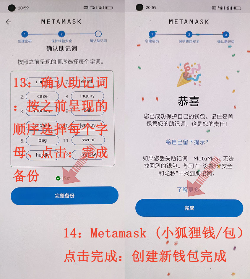 13:確認助記詞:按之前呈現的順序選擇每個字母、點擊:完成備份、Metamask (小狐貍錢/包)