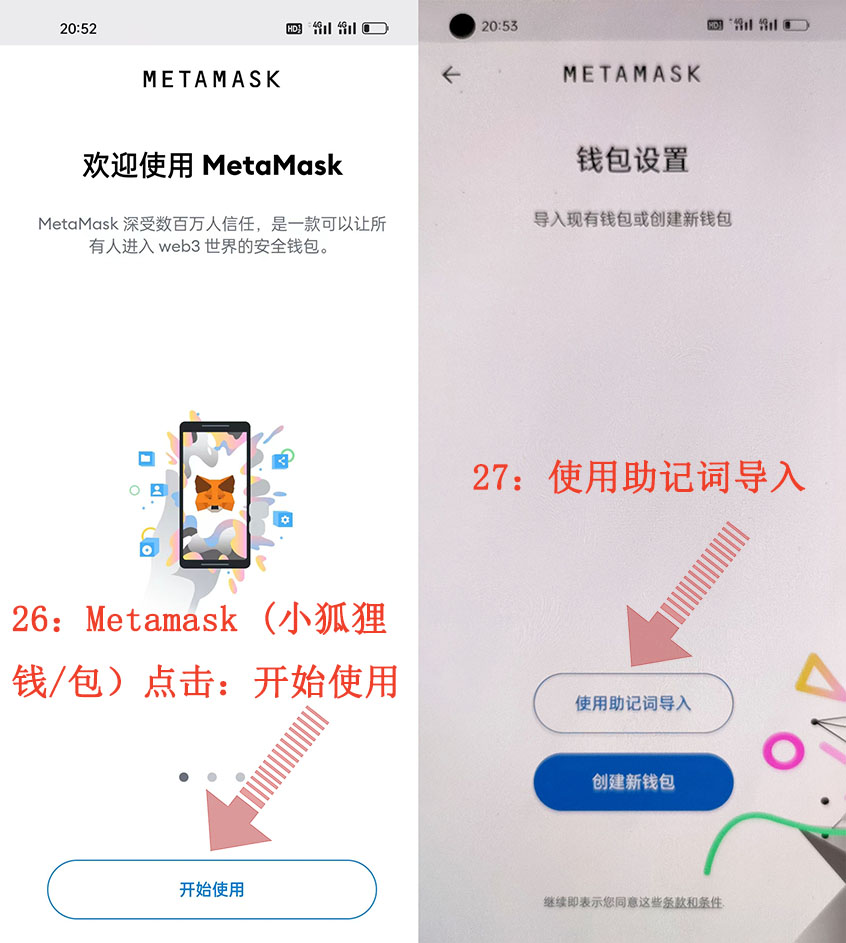 26:Metamask (小狐貍錢/包)點擊:開始使用、27:使用助記詞導入