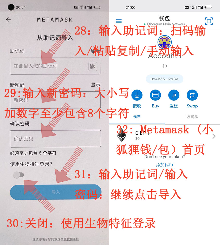 31:輸入助記詞/輸入密碼:繼續(xù)點擊導入、32:進入:Metamask (小狐貍錢/包)首頁