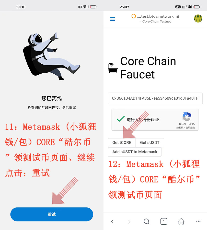 11:Metamask (小狐貍錢(qián)/包)CORE“酷爾幣”領(lǐng)測(cè)試幣頁(yè)面、繼續(xù)點(diǎn)擊:重試