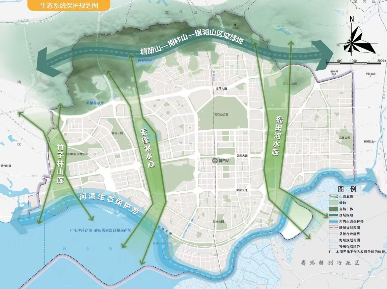 一屏:塘朗山、梅林山、銀湖山為主體構(gòu)成的區(qū)域綠;一帶:由福田紅樹(shù)林自然保護(hù)區(qū)、深圳灣海岸線與深圳河生態(tài)廊道構(gòu)成的南部河灣生態(tài)保護(hù)帶;三廊:竹子林山廊、香蜜湖水廊、福田河水廊